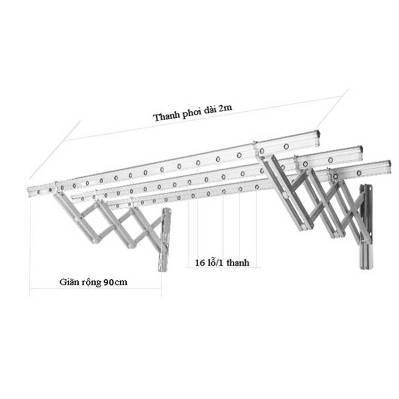 Mỗi thanh phơi dài 2m và được thiết kế dày chắc chắn, tích hợp khoảng 15 lỗ dập sẵn trên mỗi thanh giúp treo quần áo, chăn ga gối đệm mà không bị rơi hay xô lệch. Giá đỡ cơ học hỗ trợ việc kéo giãn tối đa lên đến 1,2m, đồng thời giữ giàn ổn định khi sử dụng.