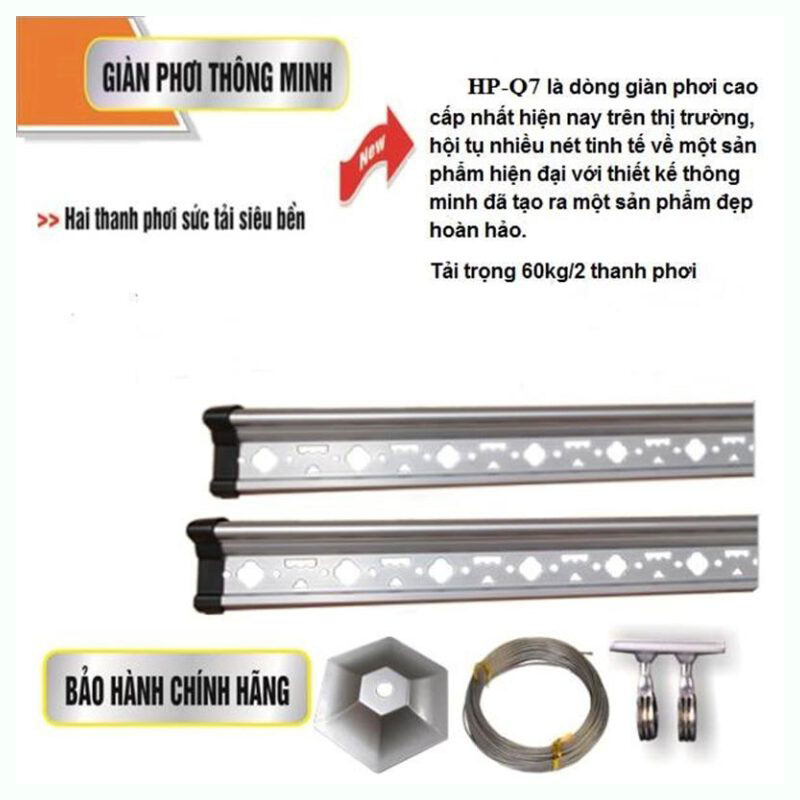 Từ buli bảo vệ, cáp inox 304, đến tem chống hàng giả, mọi chi tiết của HP-Q7 đều được hoàn thiện chắc chắn. Cáp không giãn, không rỉ và chịu tải tốt đảm bảo giàn phơi hoạt động ổn định trong thời gian dài. Hai thanh nhôm 2 m hỗ trợ treo đủ số lượng quần áo cho cả gia đình.