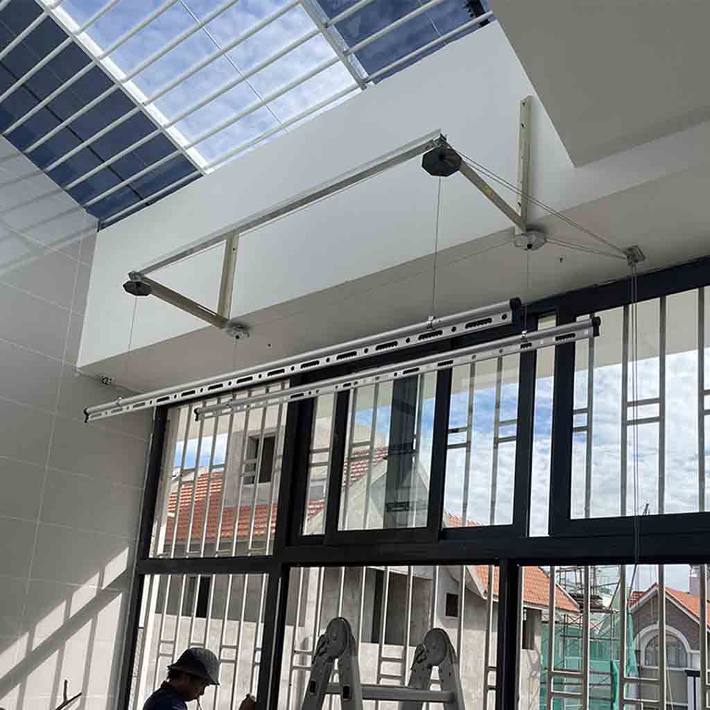 Giàn phơi sử dụng tay quay liền trục hiện đại, mang lại trải nghiệm vận hành nhẹ nhàng và chắc chắn. Dây cáp tời kép cho phép sản phẩm chịu tải lên đến 120kg, phơi được chăn ga, đồ dày hoặc lượng quần áo lớn mà không gây nặng tay.